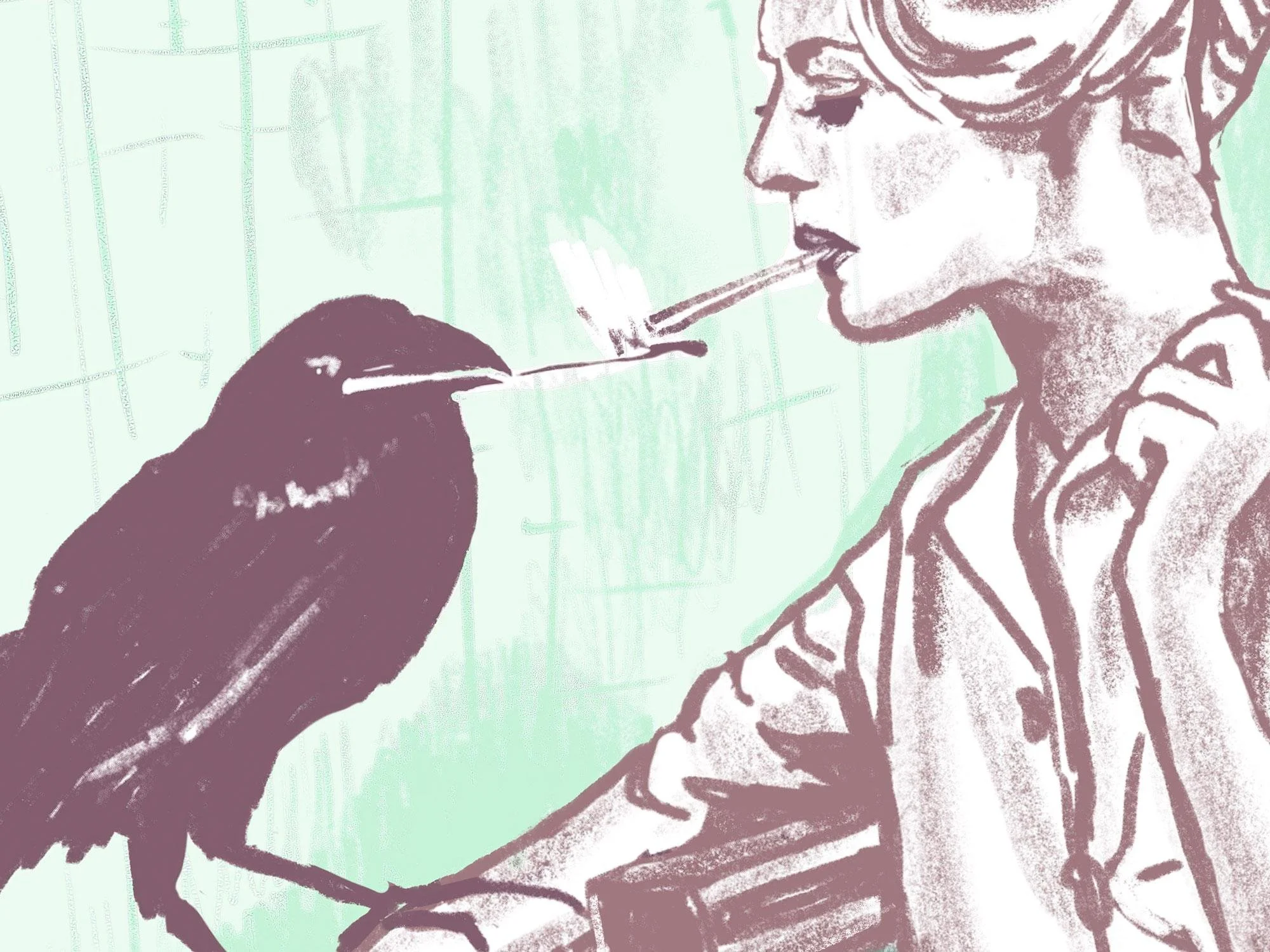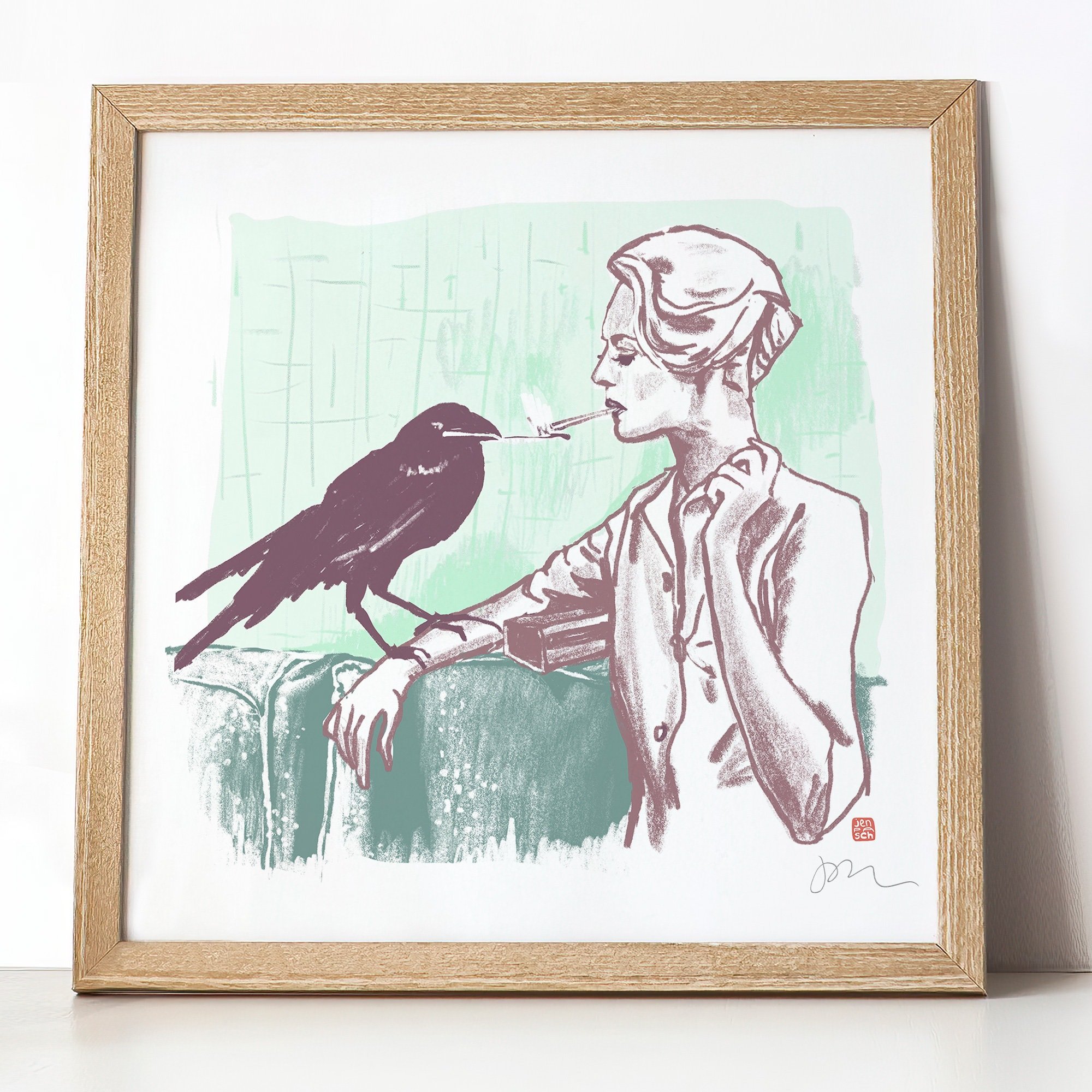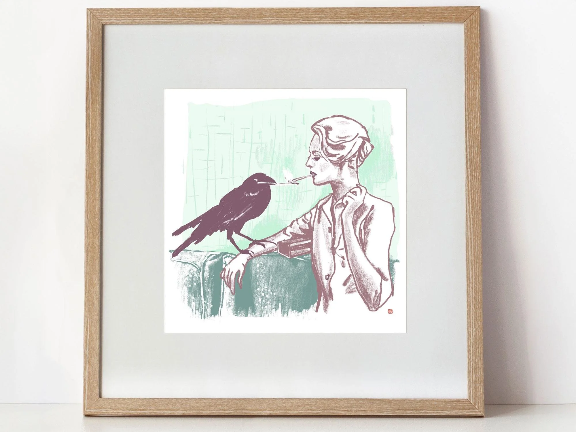 A crow perches on the arm of a woman, lighting her cigarette with a match. This is a print of an original digital drawing inspired by a publicity photo from the Hitchcock classic "The Birds." The rich colors of the muted palette are created with photographic dye inks on 100% cotton hot press fine art paper.