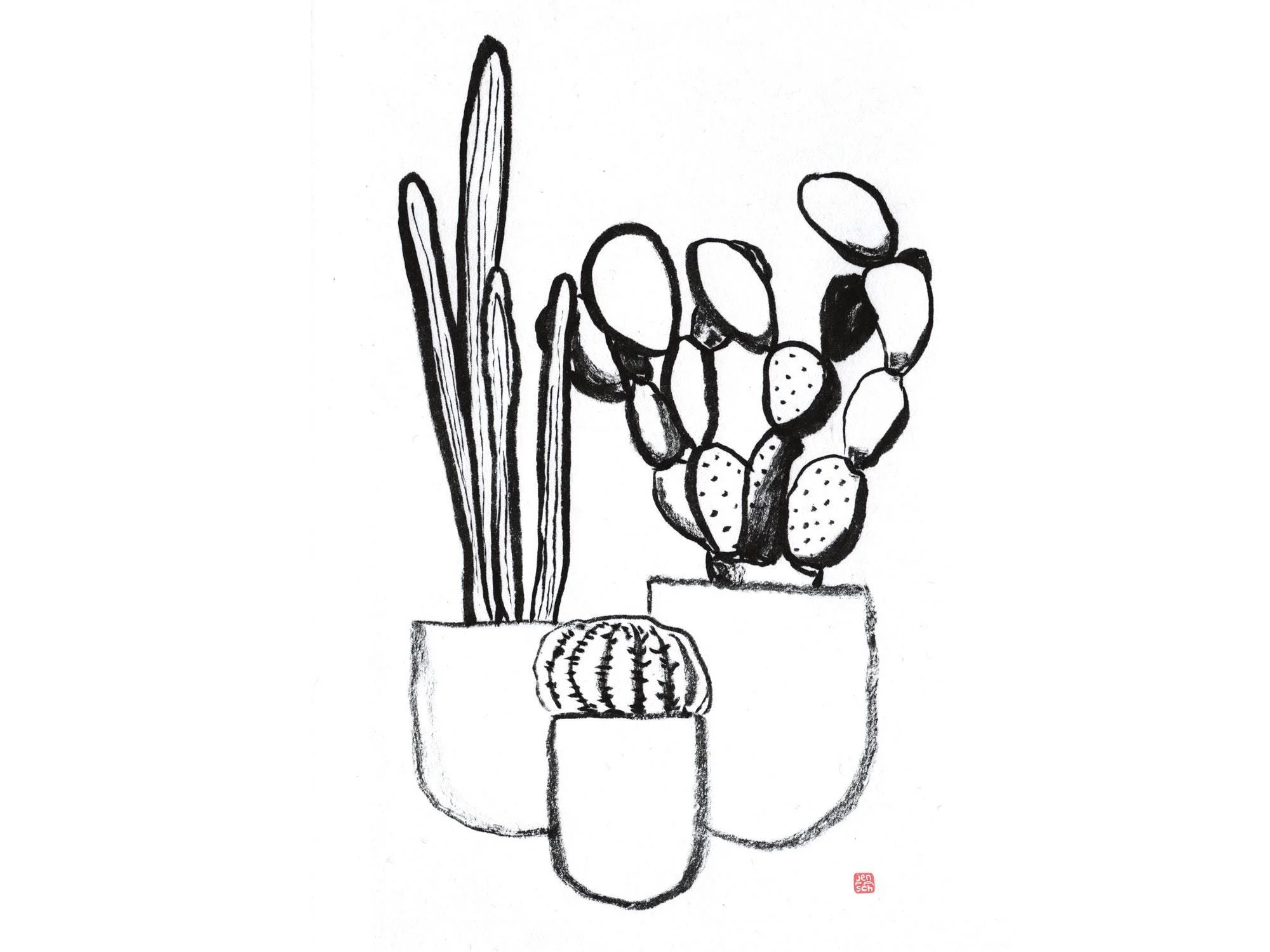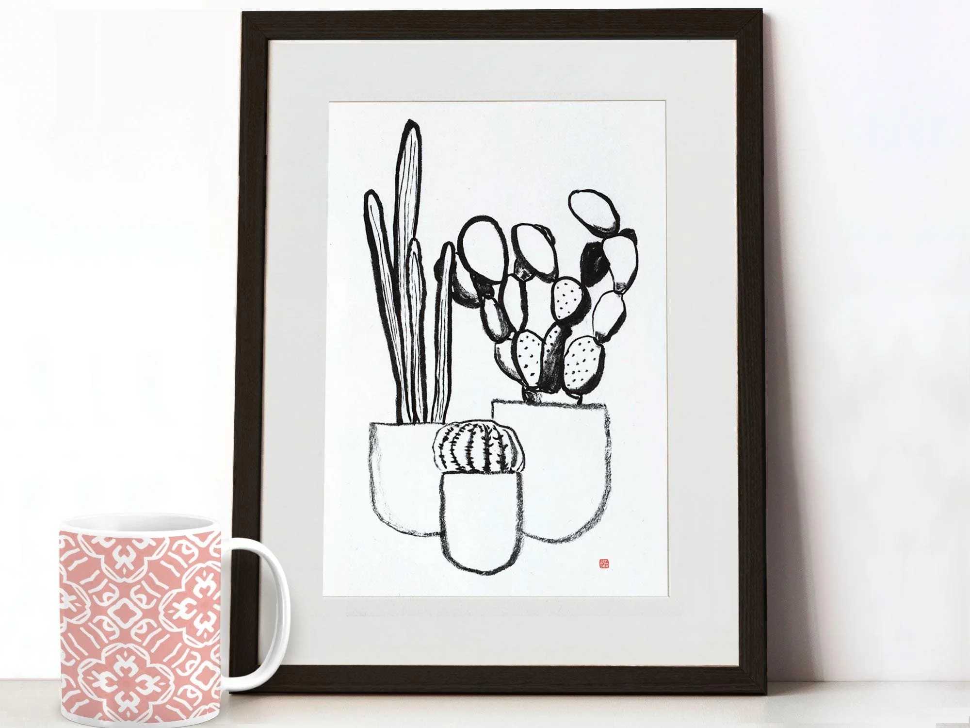 Three cacti, three rounded pots, one quietly bold statement. This minimalist ink drawing brings a touch of modern calm to any space—perfect for plant lovers, design fans, or anyone who likes their art simple and striking. Hand-illustrated by Jen Schultes (tiNGtiNG desiGN).