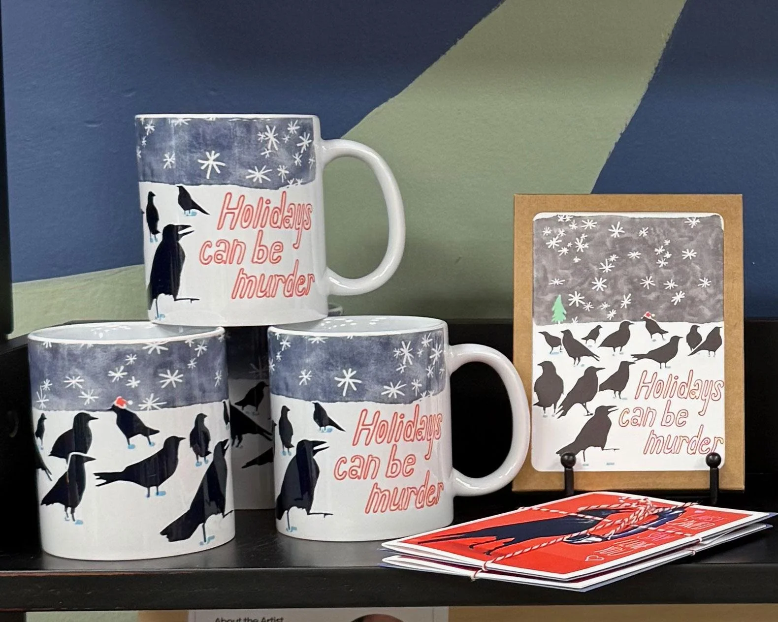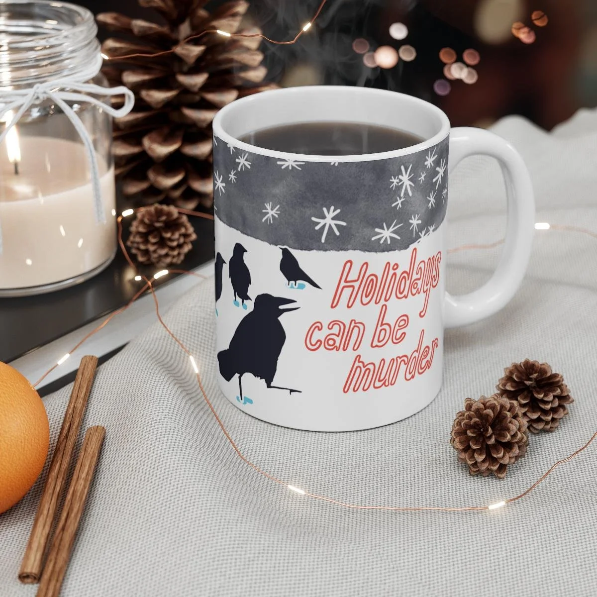 A "Holidays can be murder" holiday crow coffee mug. 11 oz. Ceramic.