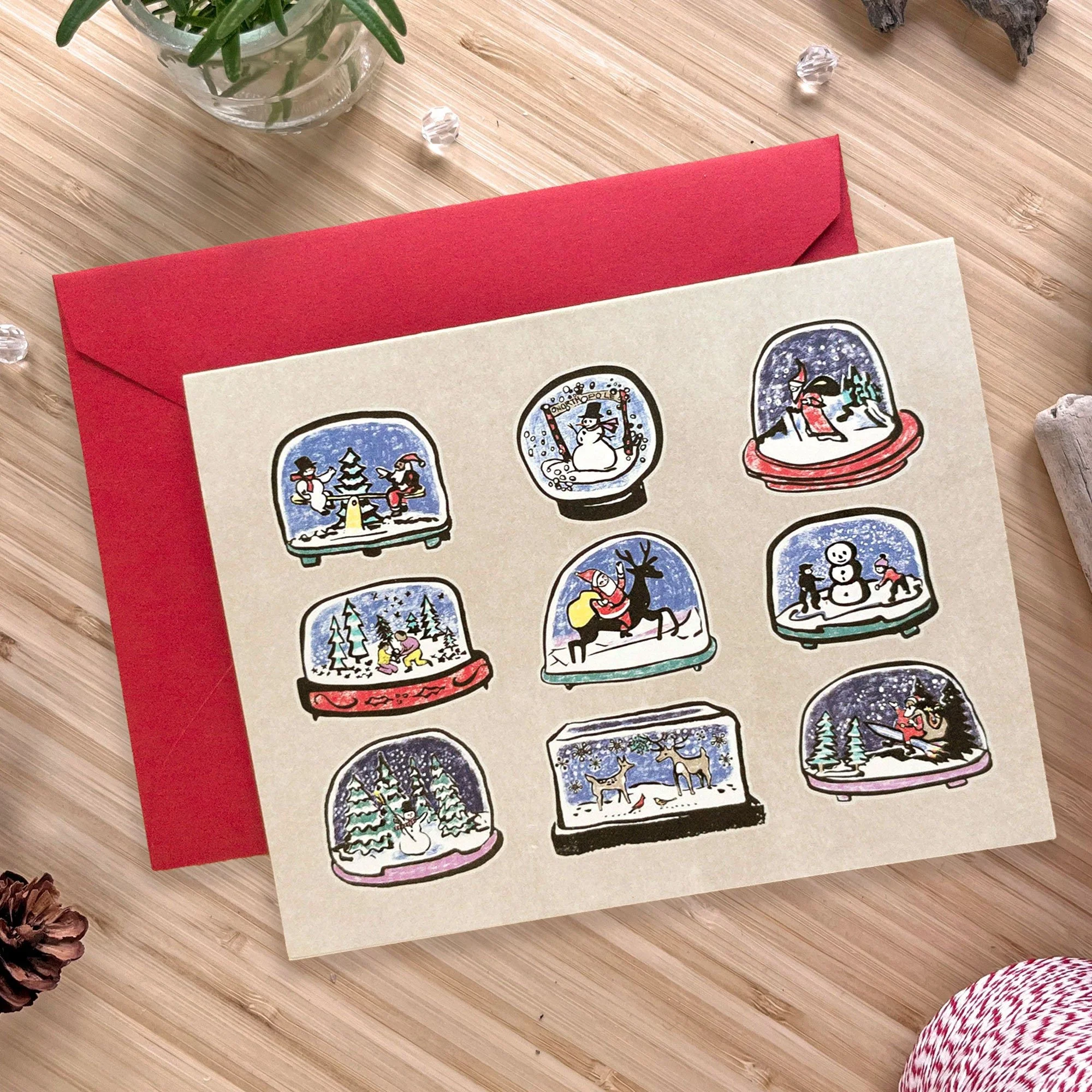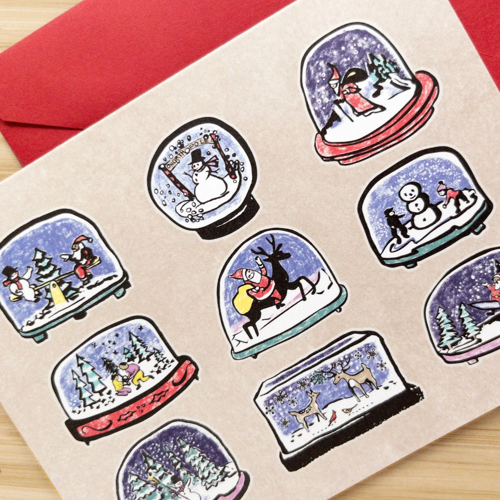 Share a little wonder with these unique holiday cards inspired by vintage snow globes! Each card features 9 original, hand-illustrated scenes—perfect for anyone who loves retro ephemera, winter magic, or just shaking things up. Designed and hand-lettered by Jen Schultes (tiNGtiNG desiGN). Blank inside for your own message.